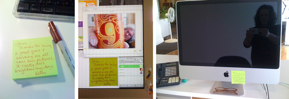 So today I wrote him a little note that read Chris, Thanks for being a good sport and sending me all your beer pictures. It really does brighten my day. Kelly