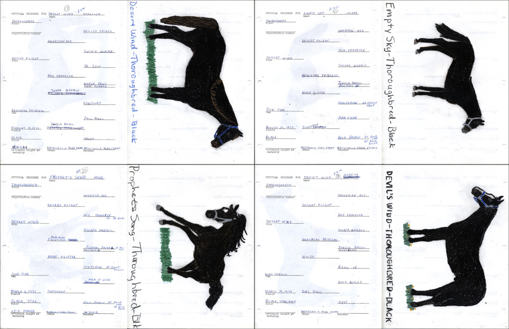I developed an entire stable of horses. It was called Mescorola Park Farms and it was home to 111 horses, mostly Thoroughbreds and Arabians. There were also several Quarter horses, a few Appaloosas, and a smattering of Lipizzan, Saddlebreds, and Morgan horses. For each horse, I wrote out the pedigree and made a crayon picture. I would sit in my dad’s den, listening to the radio and recording songs, and making my horses and reading the three or four horse magazines that I subscribed to. As my original stock reproduced, I followed the conventions for each breed in naming the offspring. I was a big Queen and Elton John fan by then, so the names were also influenced by song titles. My horse phase also resulted in my only completion of a longer piece of fiction writing, a story about—you guessed it—a horse farm. I got all sentimental about my horse notebook recently due to having been thinking about my other childhood obsession, the Ford Mustang (from my earlier years); that was the story that began my current spate of blogging. I was certain of the notebook’s location my corner of my parents’ basement so I commissioned my mom to bring it along for their current visit. It’s been 30 years, but I recognize the horses like it was last week. It’s fun to be so utterly transported to another time.