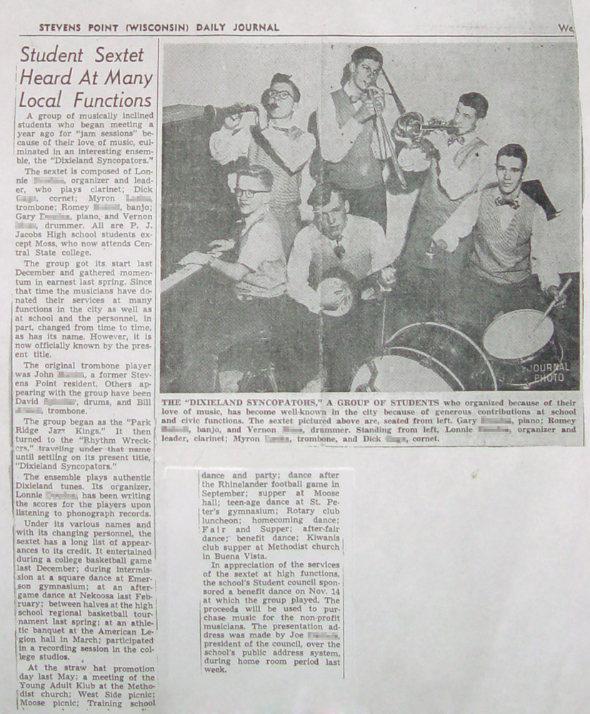 This is an article that ran in the local paper, profiling the Dixieland jazz band that my dad headed up when he was in high school. That’s my dad on clarinet and my uncle on piano, both at the left in the photo. My mom gave me this photocopy a couple of years ago; it landed on my fridge and there it has stayed. I don’t remember now if it’s an old article that she just unearthed or if it’s a recent reprint. At any rate, it’s a fun and interesting thing to have.