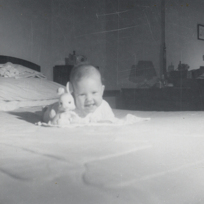 Well, of course it did, because I get it from my mother. She claims to have wheeled a bottle of Brer Rabbit Molasses around in a baby buggy when she was a girl. And she began indoctrinating me when I was just a baby. This is the earliest photo of myself that I have seen with regularity. It wasn’t enough for her to have her cute, happy baby in the middle of a giant bed. No, she posed a rabbit toy alongside. The osmosing of rabbit love began.