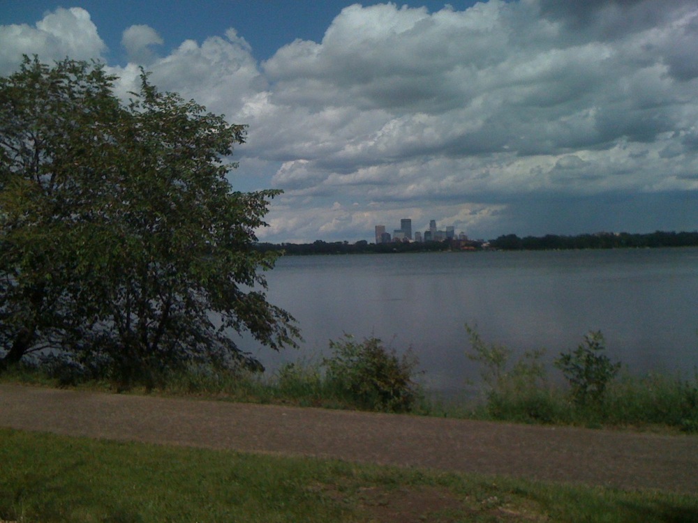 Photos 19, mile 13. West side of Lake Calhoun. Minneapolis downtown skyline in the distance. It started raining about here.
