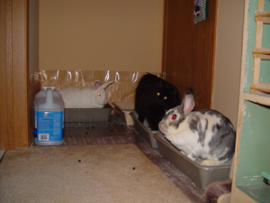 The rabbit cage had a front door. When I was around to supervise, my bun could come and go as he or she pleased and have the run of the place, all the while being able to return to the cage for refreshments or bathroom breaks. Every rabbit was reliable, and once he or she discovered the location of the cats’ litterbox were very good about using it as well. However, I never felt like I could completely let down my guard because they were, after all, chewing machines.