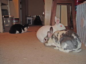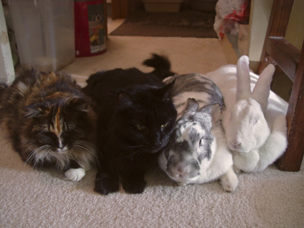 I had two cats, Dhia and Yul, and the three of them fell in together pretty quickly. Both cats had lived since kittenhood with my previous rabbits so having a hoppity brother was nothing untoward. They welcomed him into the family.
