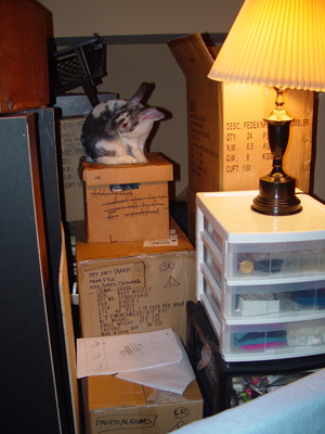 Robbin was a very athletic rabbit as opposed to Bibi, who was an utter landlubber. There was no bed or sofa that was too tall for him. It warmed the cockles of my heart to walk in the door after a tough day at work to find him folded up on the end of the couch in the front room. When we moved to my current place, all the stacked boxes waiting to be unpacked provided a nice climbing range for my mountain goat rabbit. Sometimes I believed that he thought he was a cat. He had, after all, grown up with two. He loved jumping up onto things, including the tin in which I kept his food, a not-so-subtle hint that I should feed him now.