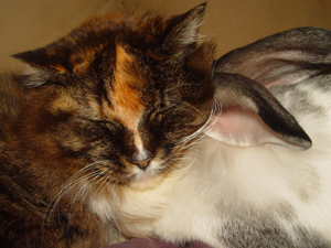 We said goodbye first to Yul and then to Dhia. Soon, CJ Cat came into our lives. She is a sweetheart but she was already about two years old. She hadn’t had the advantage of growing up with a rabbit like the other cats had. She just didn’t know what to do about Robbin and Bibi.