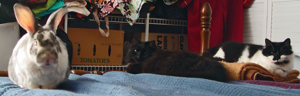 Unfortunately, Bibi was soon departed. Her malady was gut stasis, a common ailment of rabbits, but I still wonder if it wasn’t brought on by the stress of dealing with two new, semi-hostile cats. She came from a multi-species household when I adopted her, so I’m probably making that up, and yet the timing was so coincidental. Robbin reverted to being an only rabbit.