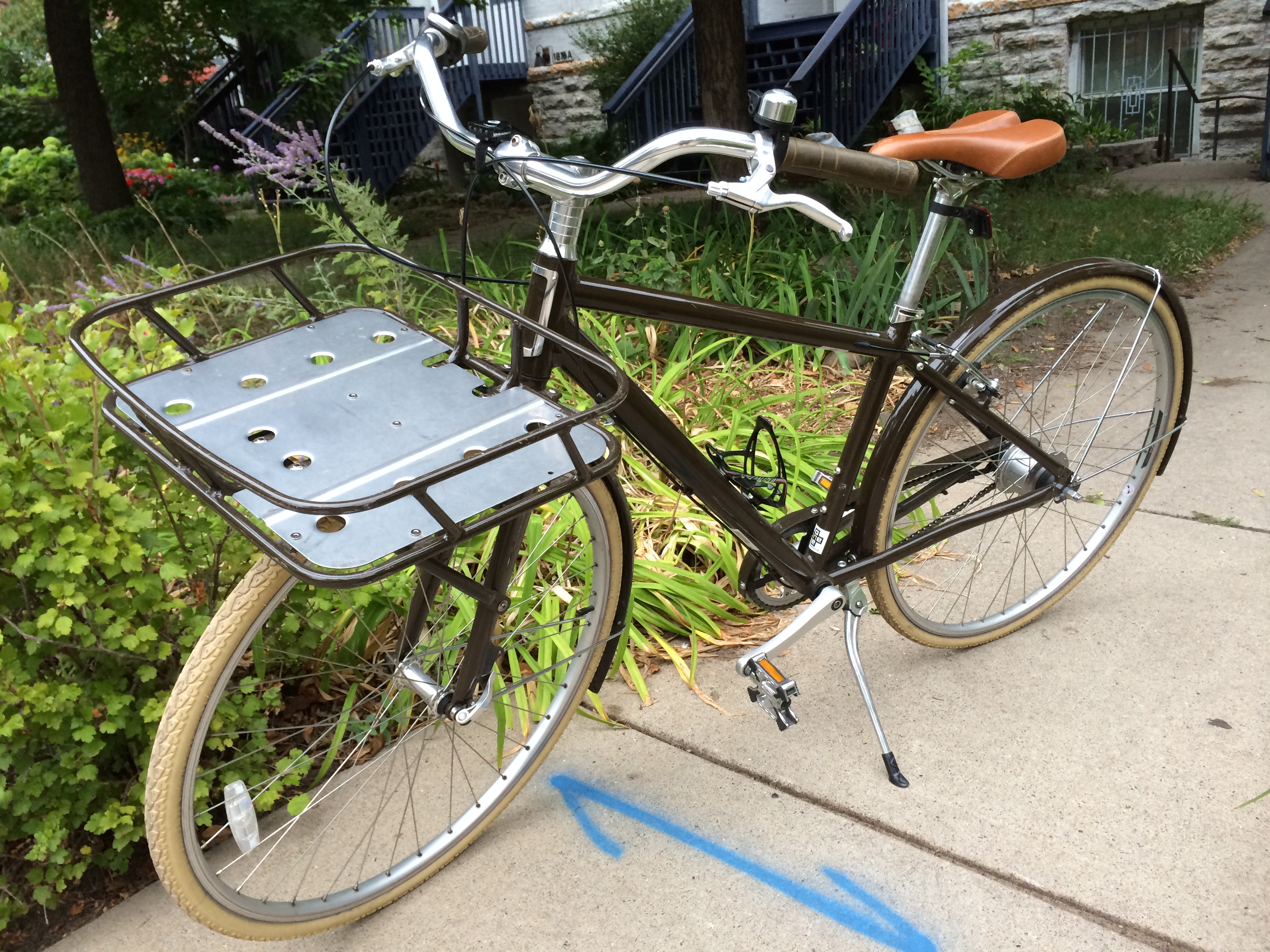 No, the beef I have with this bike is the basket. Look at it. It’s a monstrous metal crate. It makes for very front-heavy balance, which has taken some getting used to (I’m on day four with the bike). The shop guy touted it as a feature and boasted that he once carried four large pizzas in/on it. But more annoyingly, this mega-basket makes it practically impossible to maneuver through a doorway without banging and bashing the door and the frame. I have to go through two doors at home and two at the office. That’s a lot of bangers and mash (yes, yes, I know what bangers and mash really is).