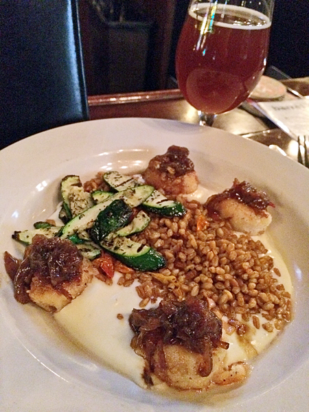 Not too long after that, another neighborhood establishment, Town Hall Brewery, had their annual Barrel Aged Beer Week. They made some crazy and delicious fancy beers, releasing one per day throughout the week. I went in right away on Monday and learned that they developed some special food items to pair with the beers. I chose the seared scallops because I have a soft spot for scallops.