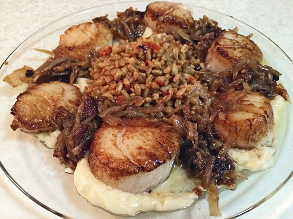I located a recipe for bacon-onion jam that used only basic ingredients, read about how to pan-sear scallops, learned some more about beurre blanc, and purchased scallops and farro. I was ready to begin. The jam recipe is not at all fussy, it just needs and hour and a half of prep and cook time to get the reduction. I got that going first and enhanced the recipe with some dried currants for good measure. The farro was next. It needed about thirty minutes, and I included chopped sun-dried tomatoes. When the farro was done cooking, I finished it by frying it for a few minutes to crisp it up a bit; there had been something a little crispy about the Town Hall plate. As the jam and farro were finishing, I heated the pan for the scallops, getting the butter and oil nice and hot. While the scallops were searing, I reheated the leftover beurre blanc in the microwave, stirring frequently. I know, I know, I can hear you laughing from here. It was a visual disaster. The fat from the butter immediately separated into yellow oiliness, and the remaining part turned into a gloppy, viscous mess. But it still tasted heavenly and it all gets re-blended in your mouth, right?