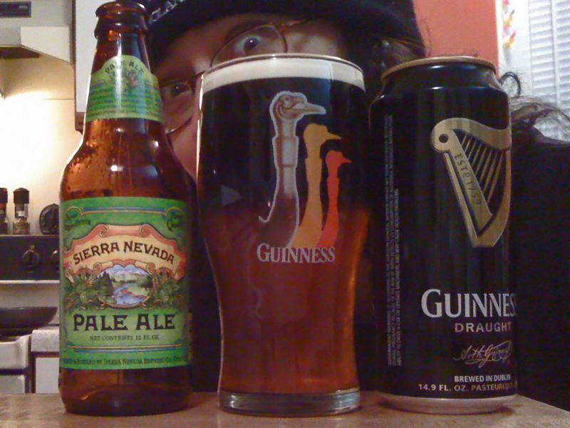 In the spirit of drinking two drinks (of my choice) at once, I decided on the way home that I was in the mood for a Black and Tan. So I jauntily entered the liquor store that is dangerously convenient on my walk home (across the street from the sushi restaurant that is dangerously convenient on my walk home) and strode to the beer cooler in the back, expecting to grab a four-pack of Guinness Draught cans and a six-pack of Bass Pale Ale bottles.