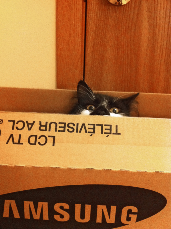A few months ago I finally joined the 2000s and got a large, flat-screen TV. I had been lumbering along with my old 21-inch CRT television that I think was close to twenty years old. I unpacked the new beauty and set it up, and put the box in front of some bookshelves in my middle room while I decided if I was going to keep the TV and then, having decided yes to that, whether I thought I needed to keep the box. During the time in which I was ignoring that monumental decision, my parents came to visit and I moved the box to the front room because I needed to get it out of the way.