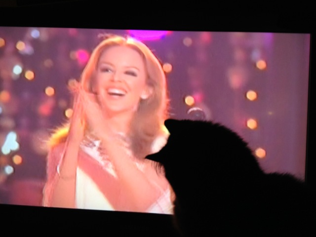 In the evening as we all were lounging in the front room where the large, flat TV box now was, none of us humans were really paying attention to what the cats (and rabbits, mine and my parents’) were doing until Dasie perched on the arm of the chair next to the box with obvious intent. She’s very athletic, generally, but somehow she managed to be in some weirdo position so that when she finally did vault herself into the box, she ended up doing a backflop into it. Not a bellyflop, but a backflop.