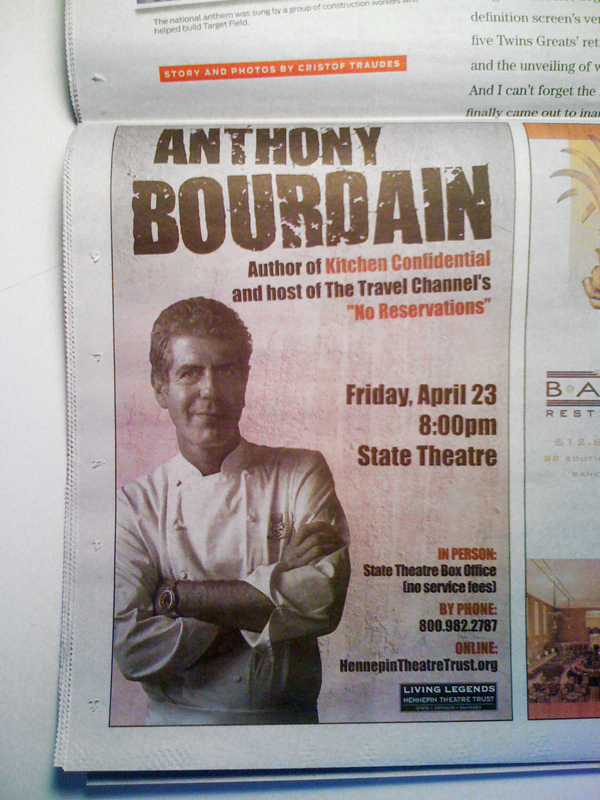 Tickets were mostly sold out by the time I got around to making my purchase. See, I originally didn???t make an effort because for a number of weeks I was under the impression that he was appearing on the same evening as Craig Ferguson, whom I also adore and who, when push came to shove, was the one I chose. But as I was leaving the box office, I just happened to pause at the Anthony Bourdain poster to sigh at it and be sad that I had had to make a choice. Then it jumped out at me. The date on the poster was not the same as the Craig Ferguson ticket I was holding in my hot little hand. I could go! I turned around and marched right back to the nice young fellow at the box office window who probably already thought I was a loser for buying the first single ticket.