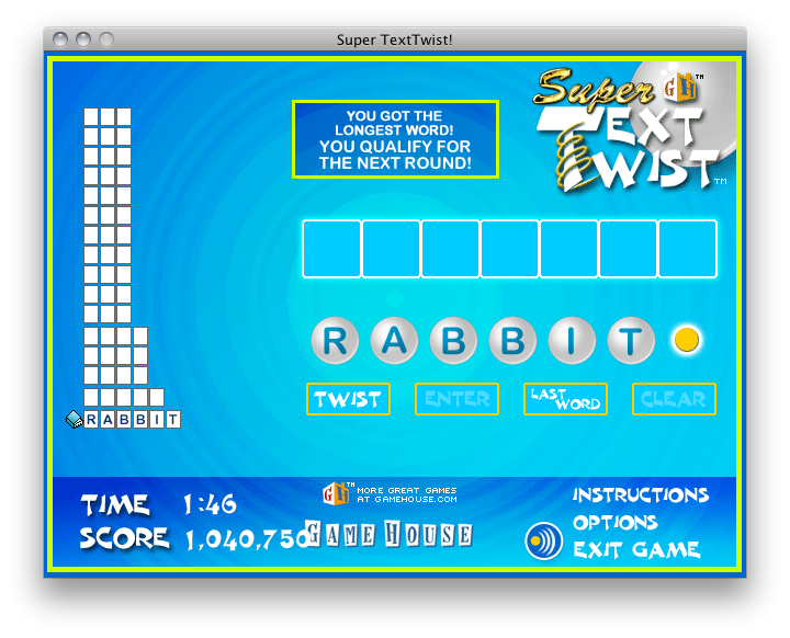 In about 2004, I finally found a game I could get behind—Super Text Twist. I play the desktop version, not online. I don’t care if I match my prowess against a bunch of people I don’t know. Initially I played the untimed version, but it didn’t take long before I took on the greater challenge (such as it is) of always playing timed. Of course, it helps that I figured out a sort of cheat that helps me figure things out if I’m having trouble.