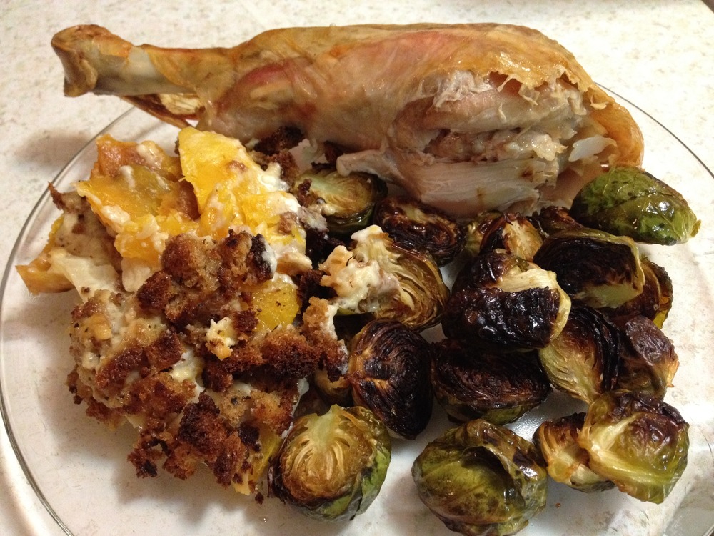 I thought the turkey in particular turned out above average. This time I differently blasted it at 450°F for the first fifteen minutes to sear the outside and hopefully lock the moisture in, then cooked it at 400°F until the little thingy popped out, which was about an hour sooner than I was expecting. Consequently, I barely had my side dishes started before the turkey was finished. I overroasted the Brussels sprouts. The butternut squash gratin, which looked great on paper but then which seemed quite less than spectacular while putting together, ended up being everybody’s favorite part of the meal. I paired the redux of yesterday’s excellent homemade cherry pie with Odell Friek, the combination of which I had been anticipating all weekend and it didn’t disappoint. Nor did my (now) perennial favorite, Ommegang Three Philosophers, with the meal. Thanks again to Tori and Aaron for introducing me to that one a couple years ago.