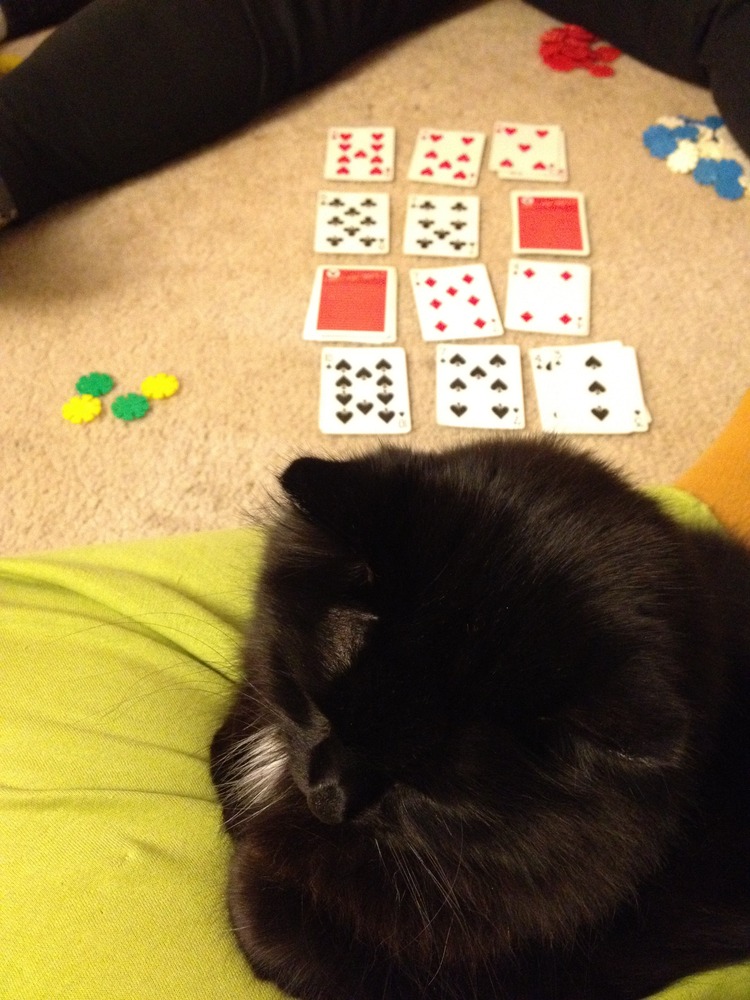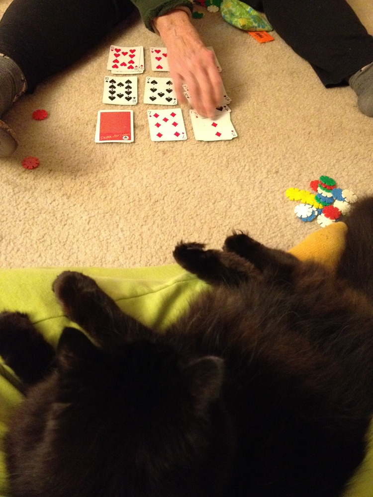 Anyway, in theory, you keep playing rounds until people run completely out of chips. In practice, that can make for a lo-o-o-o-ong session. We played for three hours with one cherry pie break. Cats, it seems, like to play, too. And they like cherry pie.