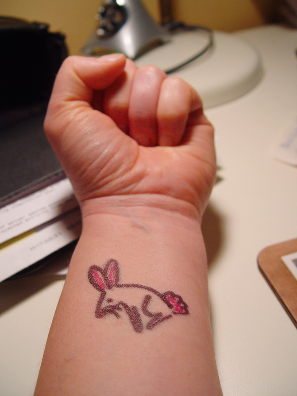 I have always maintained that if I did more body art, it would 99.9% be likely to happen as a demure nose piercing. I have never thought that I wanted to get a tattoo. But two funny things happened. About a year ago, I accidently discovered that my mom had gotten a tattoo. At age 70! Without consulting my dad! Who didn’t realize for months afterwards! I certainly don’t feel like I have to keep up, or tell anybody if I do. Then we had the marker tattoo mission. And I liked it! I didn’t try to scrub it off. Today I’ve been thinking about it again. If I did actually go through with the real thing (which I’m not saying I will), I would get this rabbit, pretty for sure. I could see having it be about 75% of the pictured size. However, I think the overall line thickness to rabbit-size proportion is exactly right. Maybe I will have it done at Saint Sabrina’s, or maybe I will have it done in Camden. TBD, perhaps sooner than I think.A symbol of my heritage
