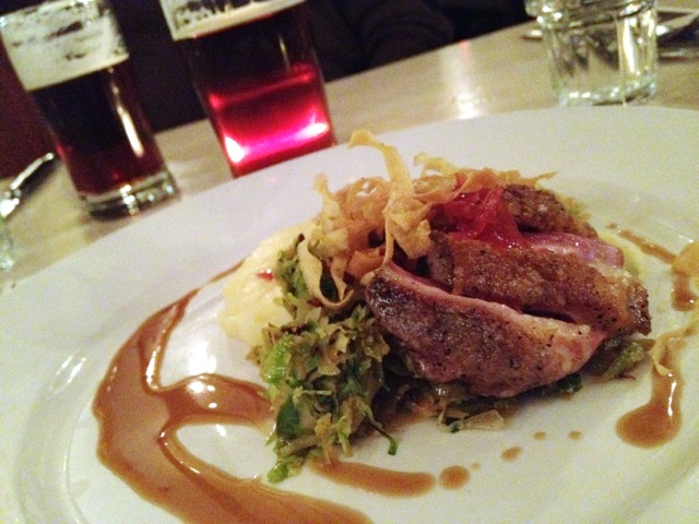I thought the turkey in particular turned out above average. This time I differently blasted it at 450°F for the first fifteen minutes to sear the outside and hopefully lock the moisture in, then cooked it at 400°F until the little thingy popped out, which was about an hour sooner than I was expecting. Consequently, I barely had my side dishes started before the turkey was finished. I overroasted the Brussels sprouts. The butternut squash gratin, which looked great on paper but then which seemed quite less than spectacular while putting together, ended up being everybody’s favorite part of the meal. I paired the redux of yesterday’s excellent homemade cherry pie with Odell Friek, the combination of which I had been anticipating all weekend and it didn’t disappoint. Nor did my (now) perennial favorite, Ommegang Three Philosophers, with the meal. Thanks again to Tori and Aaron for introducing me to that one a couple years ago.