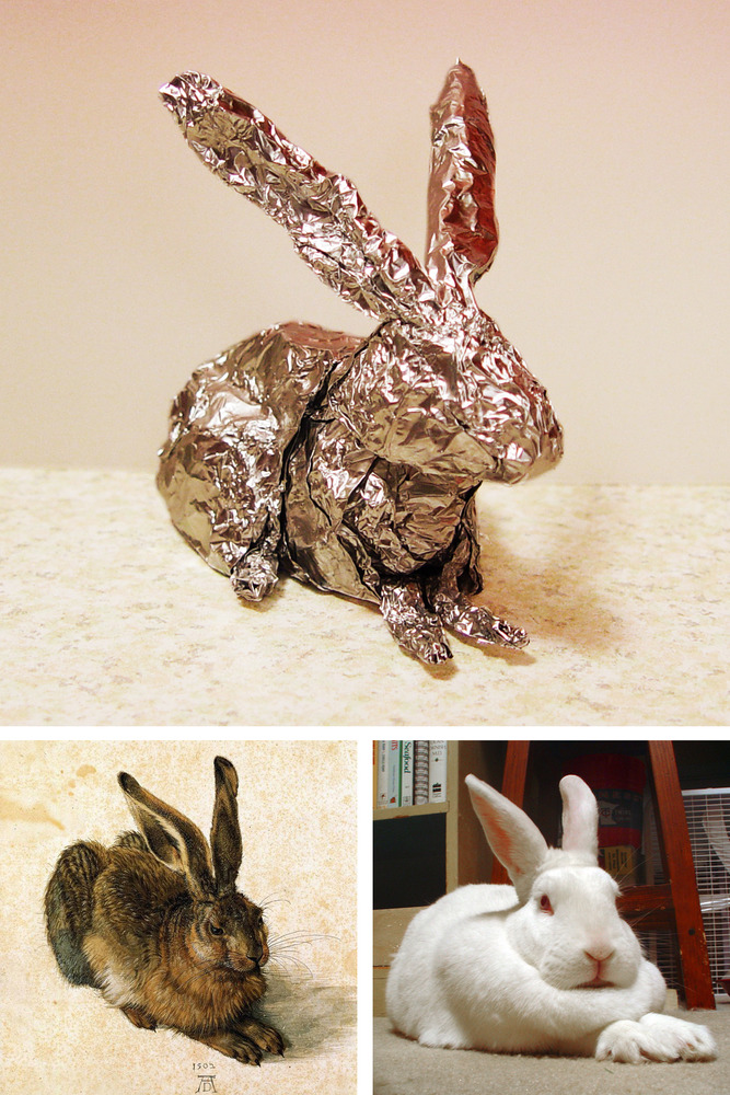 Take Albrecht Dürer’s Portrait of a Young Hare, for example. My former rabbit Bibi did a much better job of recreating it in the course of her daily life than I did this evening with aluminum foil and intention.