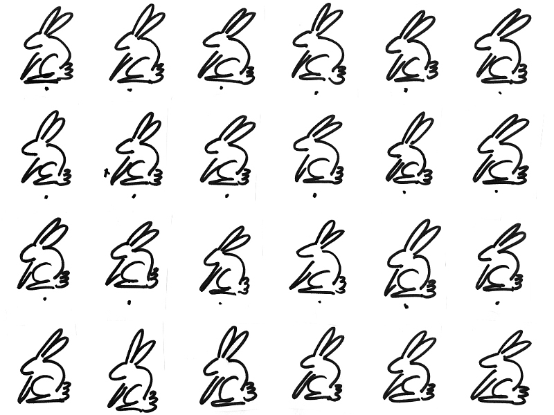 I have drawn this rabbit a lot in the last year and a half, yet when it came time to draw one for the tattoo, well, I guess I experienced some performance pressure. I thought I’d whip one out in a maximum of ten rabbits. Turns out, it was fifteen pages of twenty-four rabbits. That’s just under one rabbit for each day of the year.