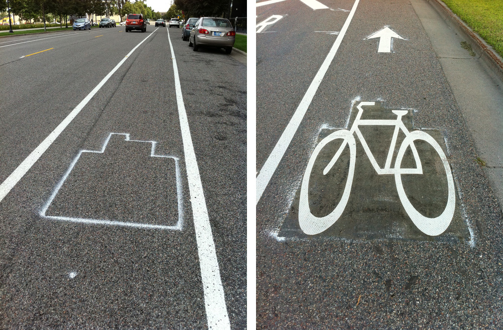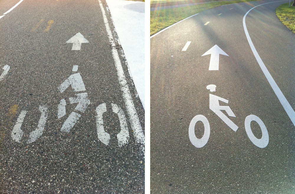 Being the over-documentarian that I am, I began to notice and photograph other bike lane pictograms that I encounter. On a street near the riverfront that has recently been tarred and chipped, I kept seeing these blocky shapes (left). I thought, oh that’s cute, somebody graffitied abstract skyscraper shapes on the road. After seeing three or four of them, duh, it’s in preparation for a biking dude (or dudette). The bike lanes to and from the grocery store already had theirs (right).