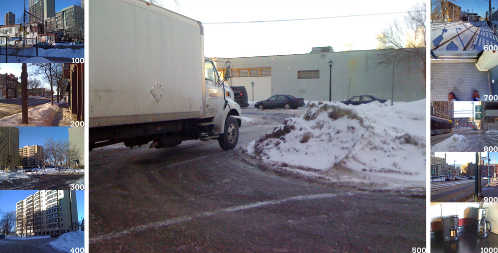 100 paces: I’m almost to the sidewalk along Cedar Avenue. That’s neighborhood institution Palmer’s Bar across the street and the Riverside Plaza highrises in the distance. (Pop culture note: In the Mary Tyler Moore Show, those highrises were where Mary moved to from her first apartment in the large house.)
