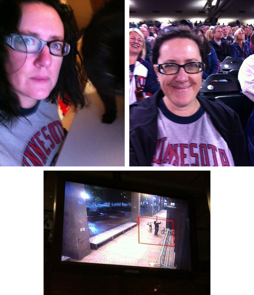 The weather was iffy today, and if there’s a chance it will rain, I park my bike at a nearby building under its overhang for shelter. (My office and Target Field are within a few blocks of each other so I just leave my bike where it is when I go to a game.) I guess because it’s a utility company they have good security, including a camera that monitors the front where the bike rack is. And something in its software motion detects and draws a red box around the mover. That’s me! I find it a little creepy that it can do that, but at the same time, sometimes I dance around a little just to see how the square changes size. I had snapped this picture to share my thoughts about it elsewhere, then couldn’t resist also sharing it with the other right nowers.