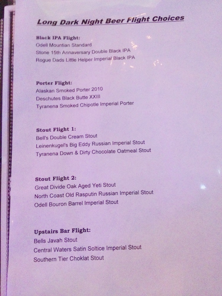 I started with the Upstairs Bar Flight. I was very glad they were doing flights. I quite enjoyed the Bell’s Java and Southern Tier Choklat. Then I had the Black IPA and Stout #1 flights.