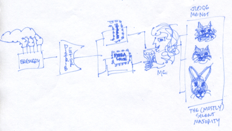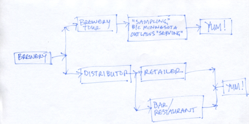 So then I started thinking more abstractly about the beer delivery system that’s in place in the state of Minnesota and made a feeble flow chart. It’s particularly relevant because at this very moment, Surly Brewing is in the midst of a campaign to rewrite Minnesota’s archaic alcohol laws. The one that impacts me personally is the one that prevents liquor stores from being open on Sundays. How backward is that?