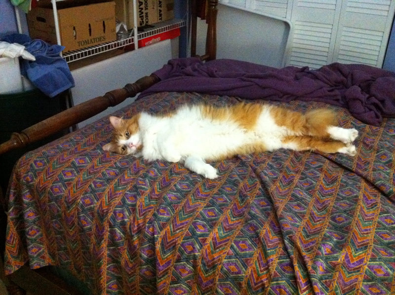 So I brought Nick downstairs to mine. I have air conditioning and I’m not afraid to use it. Just ask the electric company. I weighed his physical comfort against the mental stress of being plopped into a strange environment that includes my two cats and rabbit. My conclusion was that while he may be used to being hot, he’s used to being hot when Ruth is there to monitor his health. I’m not there. I decided that I didn’t want to risk his expiring from heatstroke on my watch.