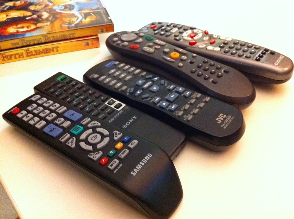 This evening, I watched a DVD on the new TV for the first time, so that accounts for the fifth remote. I was hoping for better visual quality, but I suppose because it’s DVD and not HD, it’s not really going to look that crisp. That’s why it’s advantageous to sit ten feet away. From ten feet away, it looks like widescreen. I can’t really see the jaggies at all.