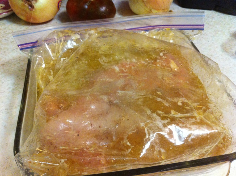 I had gotten the chicken marinating the afternoon before, so they ended up marinating for 24 hours. I only got three breasts (or breast halves, I guess) because they were giant, and cut each of those in half.