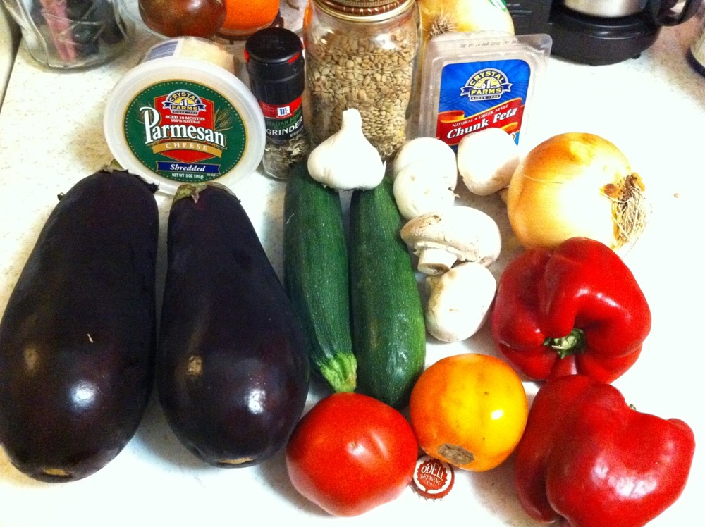 To make use of a lot of the vegetables, I found a recipe for Italian Stuffed Eggplant from one of my favorite cookbooks, The Low-Fat Way to Cook (Oxmoor House, 1993, p. 126). I adapted it to use lentils instead of brown rice, and feta cheese instead of mozzarella.