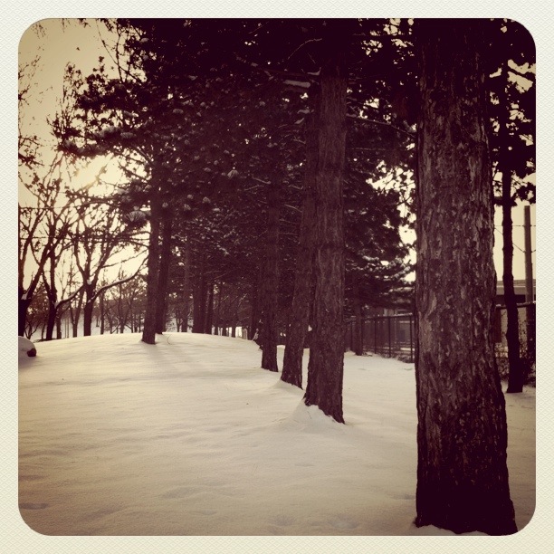 I will end by coming full-circle, with what you probably knew would have to creep in at some point. This is one of my two favorite shots I’ve produced so far with Instagram, the latest apply-a-filter app. These are other pine trees next to the train station, taken after the snow we had the first week of December.